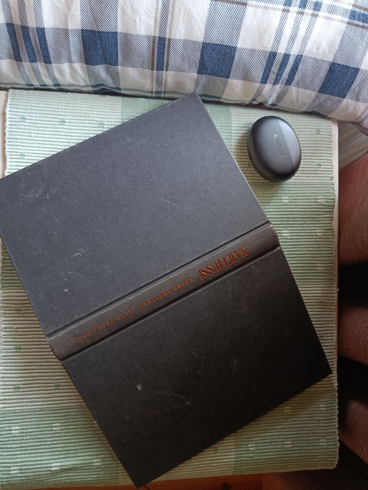 Yöpöydällä Lasse Lehtisen ja Arto Paasilinnan Nätti-Jussi omasta kirjahyllystä - sopivan kevyttä lukemista. Olohuoneen pöydällä on käsitöiden ohella vain käsityölehtiä ja ohjeita.
