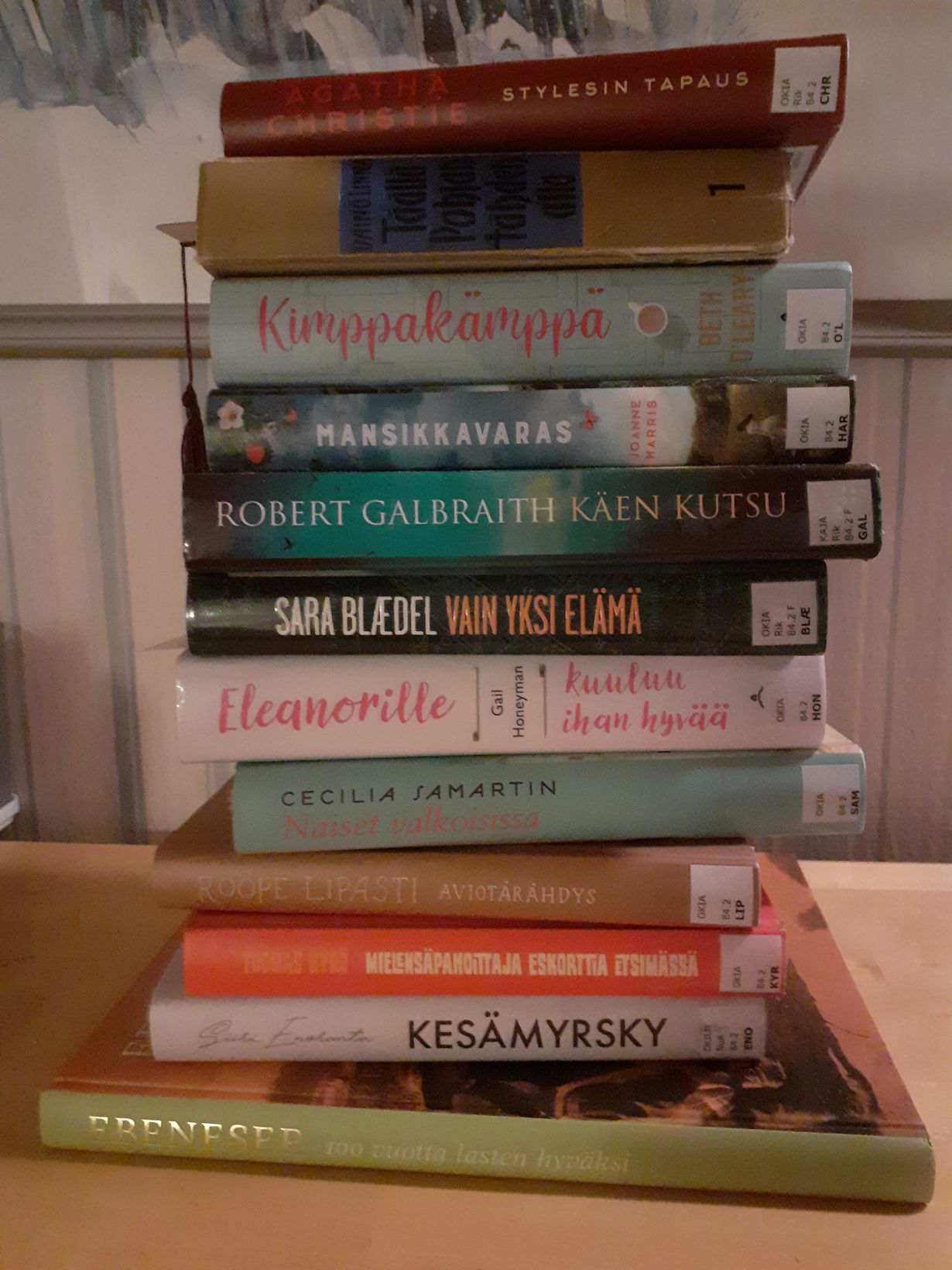 Tässäpä tämän hetkinen valikoimani iltalukemisiksi: pari omaa kirjaa ja loput kirjastosta. Luen vuosittain 60-70 kirjaa.
