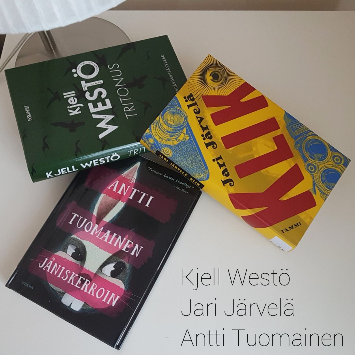 Luettuani Outi Pakkasen 3 kirjaa loppuun, vein ne kirjastoon, ja lainasin uutta lukemista: Kjell Westön "Tritonus", Jari Järvelän "Klik" ja Antti Tuomaisen "Jäniskerroin". Kirjastossa on hyvin huomioitu korona-aika. Hyvä että voi lainata kirjastokirjoja.