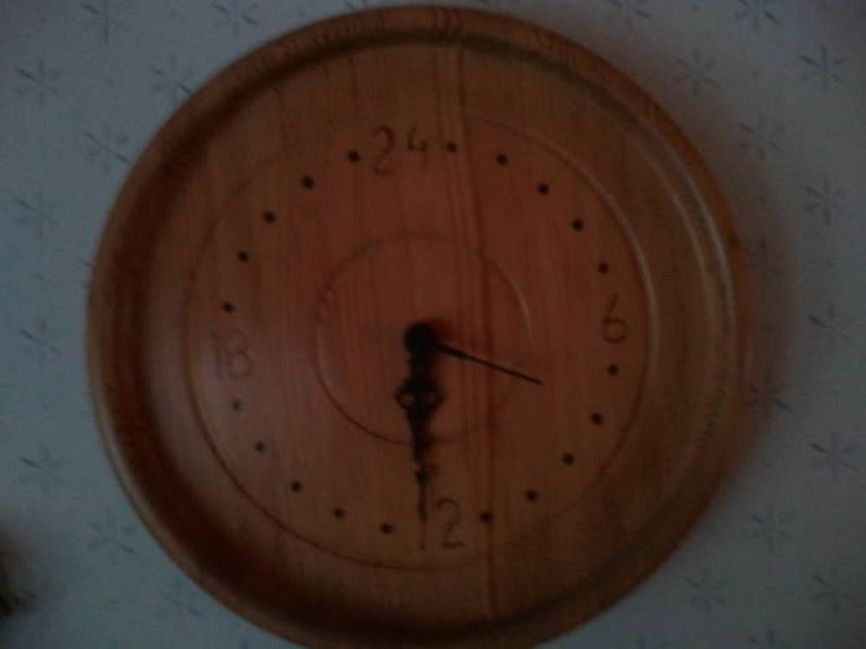 Tämä kello on tehty yhteistyönä isäni kanssa 18.1.1989. Isä sorvasi kellon ja minä kolvasin numerot ja taakse päivämäärän. Olen itse ollut kelloa tehtäessä vähän toisella kymmenellä.