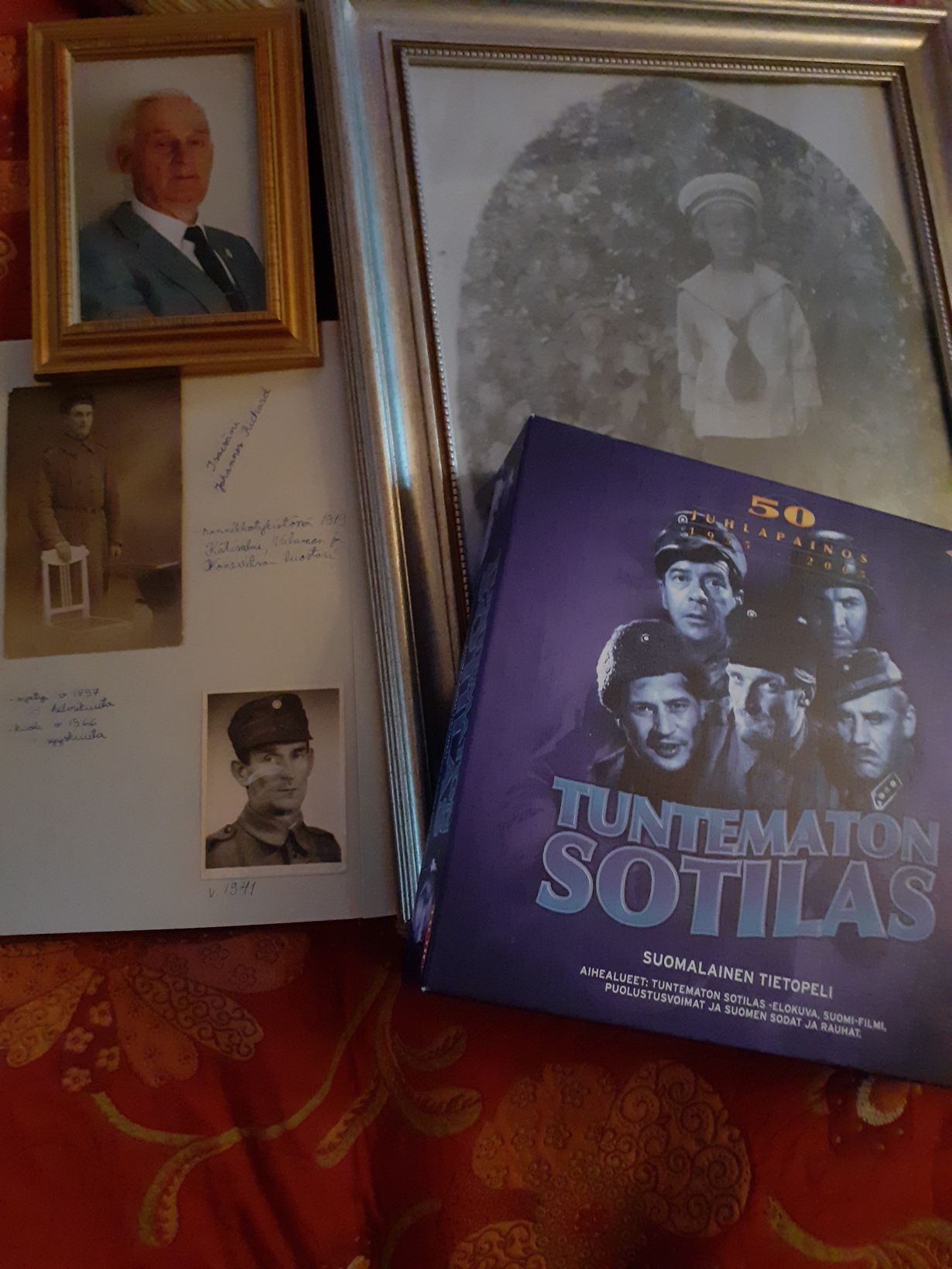 Isoisäni oli 1939-41 sodassa, kuoli jo 1966, isäni oli varsinainen tuntematon sotilas, sillä hän oli syntynyt 1922 ja meni tosi nuorena talvisotaan ja jatkosotaan. Kuoli 2007. Katsoimme aina nuorena koko perhe Tuntematonta sotilasta ja isä luki paljon sotakirjoja. Minulla oli veljiä kuusi, joten olen kuullut paljon armeijajuttuja. Kotimaisia leffoja katsottiin koko perhe ja elokuvista tykkään. Tässä kysytään sekä Tuntematon sotilasta kirjasta/elokuvasta, kotimaisesta elokuvasta ja koska minulla on Helsingissä kaksi poikaa, ostin tämän ja olen välittänyt itsenäisyyspäivä tradition. Tuntematon sotilas - elokuvan, joskus myös tätä peliä pelataan. Vanhempieni juuret ovat molemmilla Karjalassa eli joutuivat kaksi krt jättämään kotinsa. yt Leena 55 v