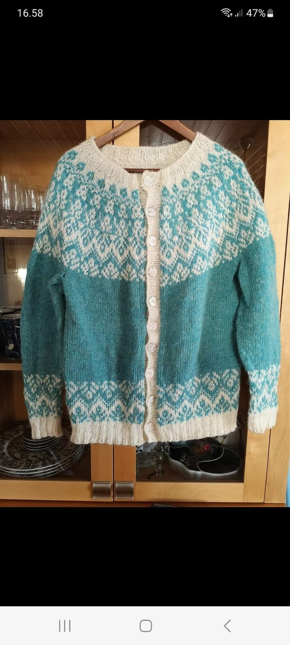 Kudoin tämän villatakin äidilleni 60-vuotislahjaksi. Yhden kevään ja kesän hän ehti takkia käyttää ennen kuin menehtyi syöpään kaksi vuotta sitten.