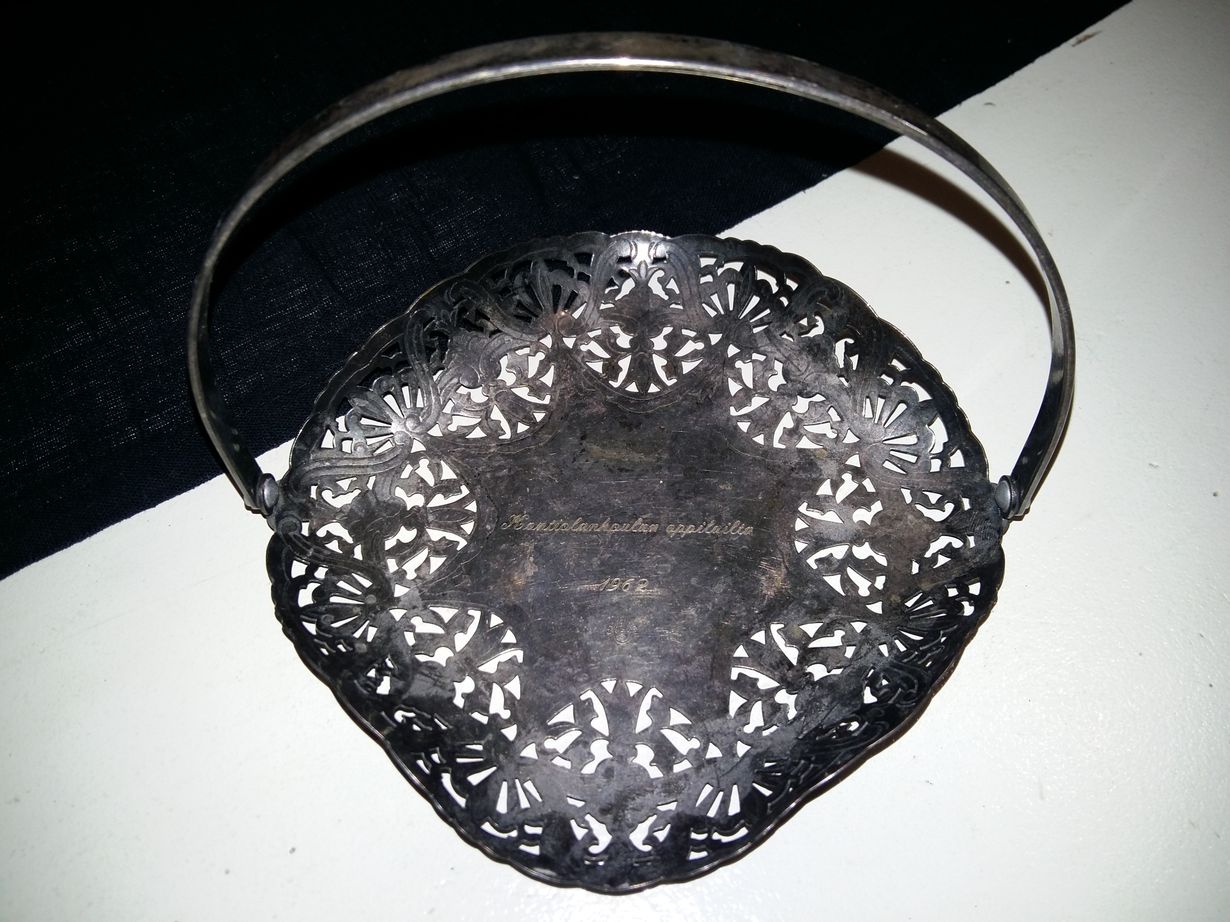Isotätini on kansakoulun opettajana saanut lahjaksi vuonna -62 tämän söpön pikku tarjottimen. Jouluni koristuu mummon kirjomalla pellavaliinalla, punaisilla Mariskooleilla suklaineen ja pähkinöineen, useilla kynttilöillä ja valoilla sekä jollain vaihtuvalla - mutta tämä tarjotin on aina osa kynttiläasetelmaa useimmiten kullanvärisellä kynttilällä ja pikku kävyillä.