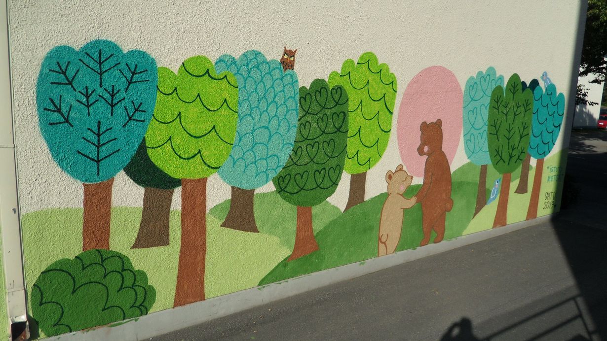 Istuta metsä! on tämän taideteoksen nimi, v. 2019 katutaidetta Pieksämäellä.