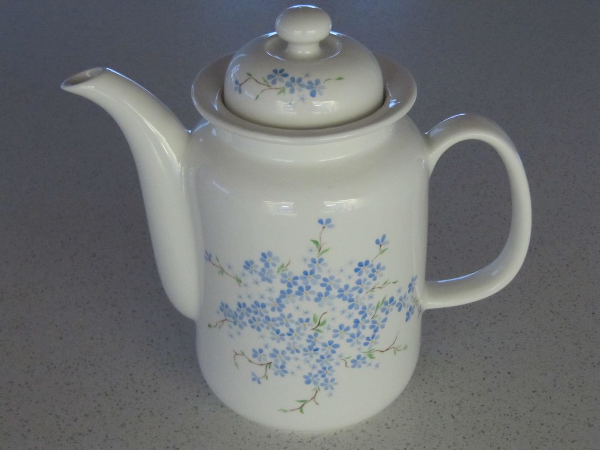 Maalasin lukiotyttönä 1980-luvulla posliinia muiden mummojen kanssa. Arabian kannu sai hennot siniset kukkaset. Sitä ei ole ikinä käytetty.