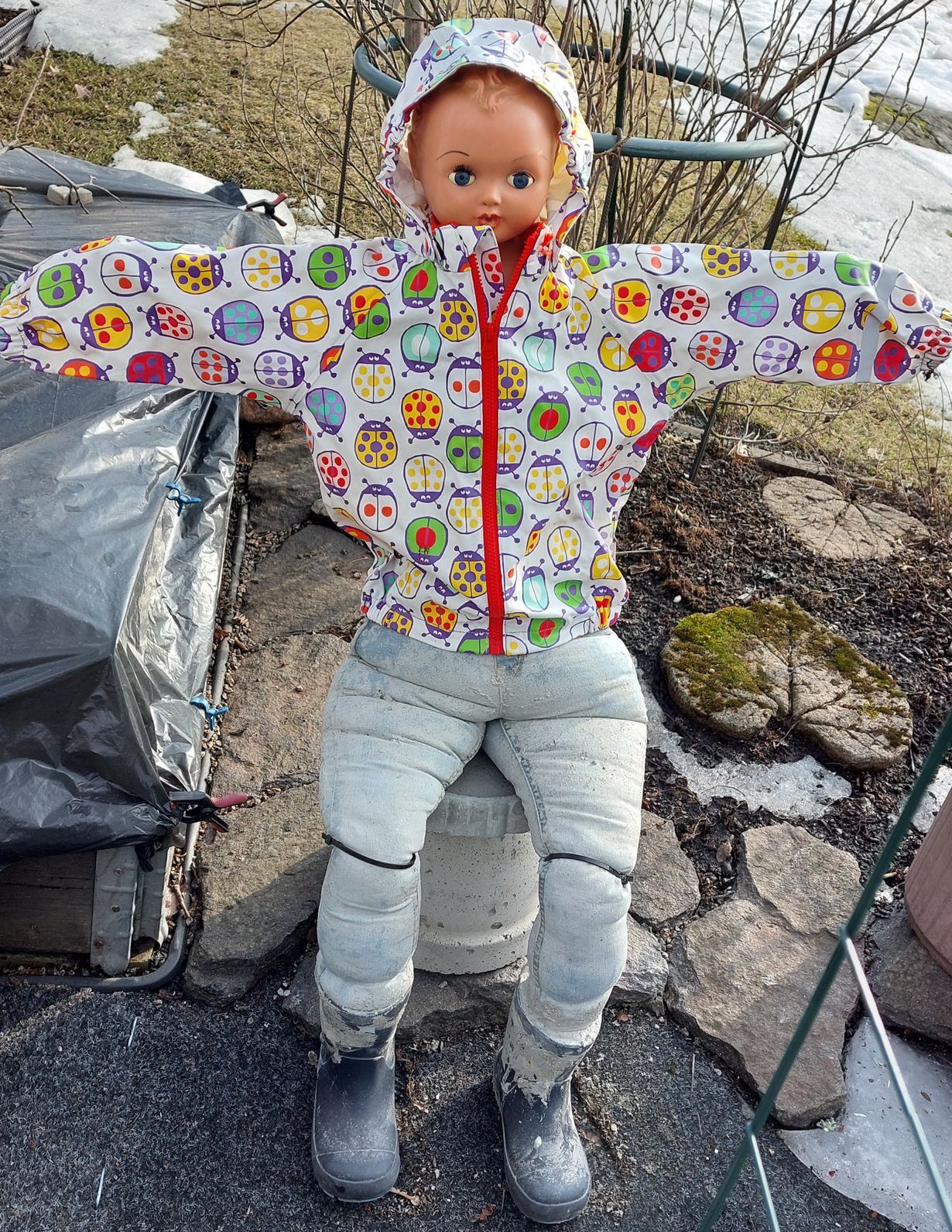 Linnunpelättimen tein itse. Vanhat lasten saappaat ja farkut täytin betonilla johon upotin tikun jonka varassa nuken vartalo. Päälle vielä vanha sadetakki.