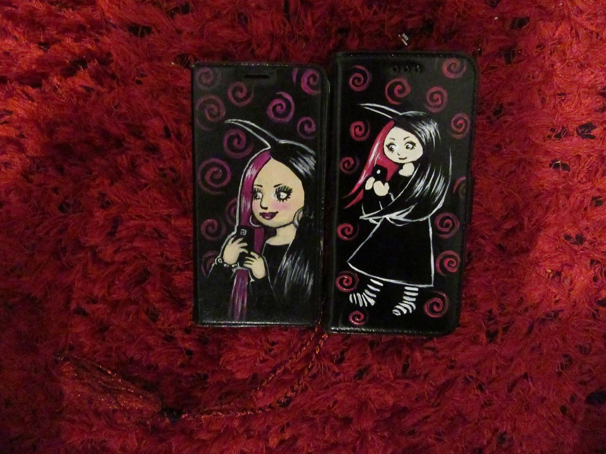 Kuvassa näkyy vanhan ja uuden puhelimeni kotelot, joihin molempiin olen maalannut itseni sarjakuvahahmona puhelinta räpläämässä.