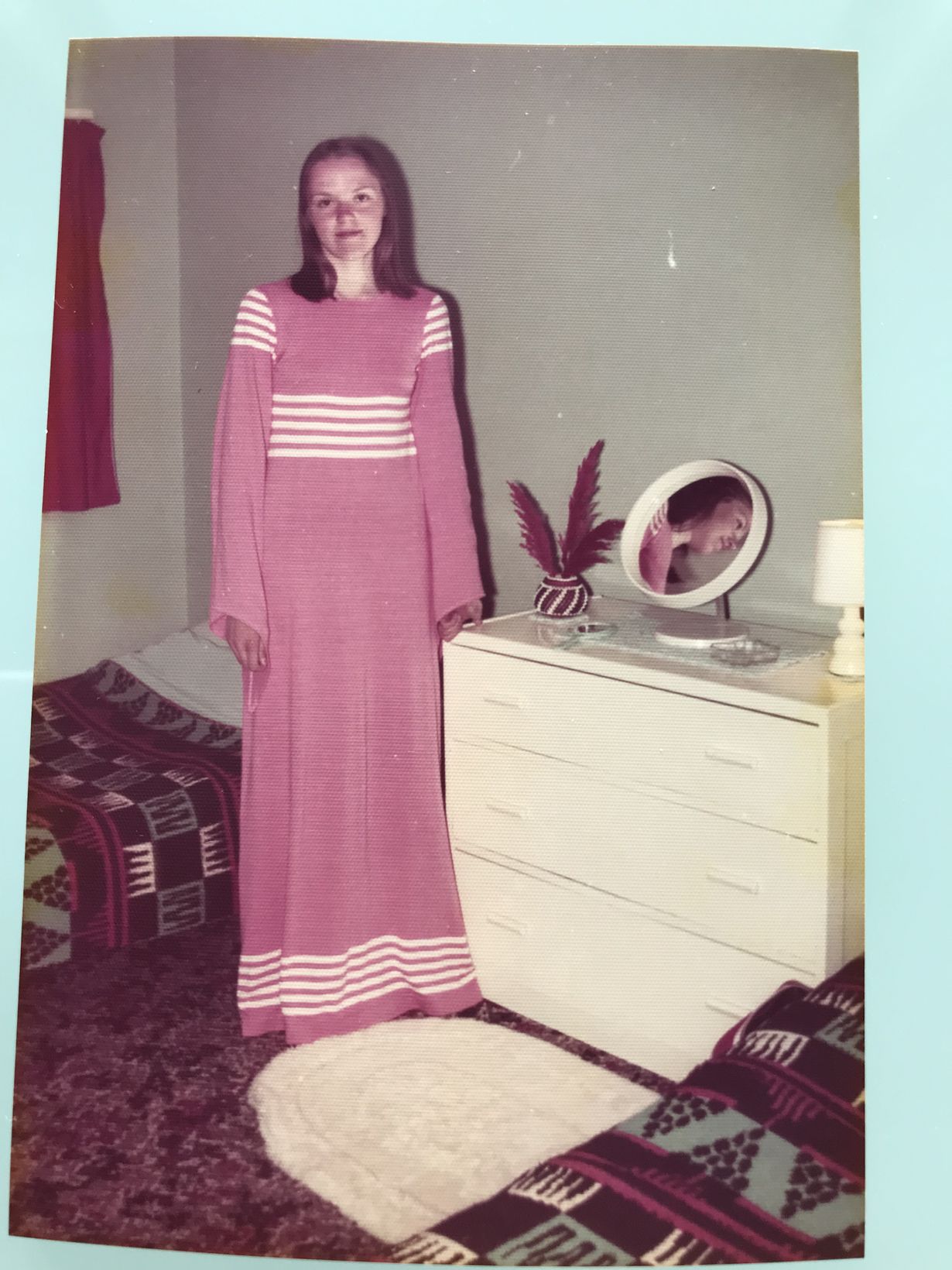 Pääsin pankkilainan turvin kielikurssille kesällä 1974. Matkapuvuston tein itse, myös kaikki trikoovaatteet. Kotiasun tein Marimekon trikoosta samanlaisin hihoin kuin oli prinsessa Annen hääpuvussa. Perheen isännän mielestä olin ’undressed’ tuossa asussa.