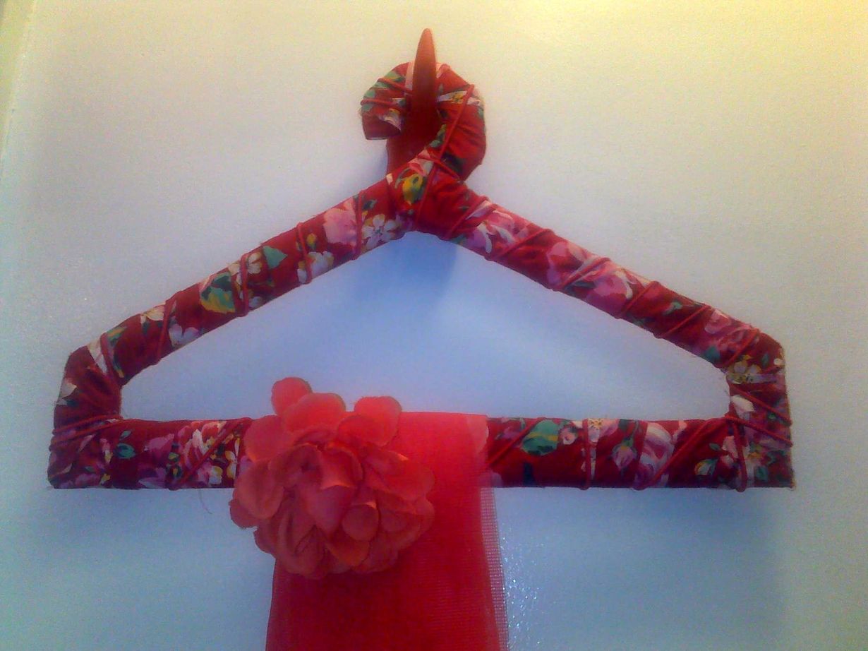Jämäkankaasta ja punaisesta kangaskuminauhasta väsätty henkari piristää vaatekomeroa
