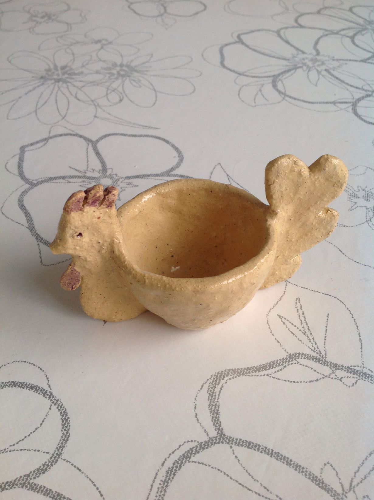 Olen tehnyt munakupin parikymmentä vuotta sitten keramiikkapiirissä. Kuppeja oli kaksi kappaletta, toinen kana lienee juossut piiloon munimaan.