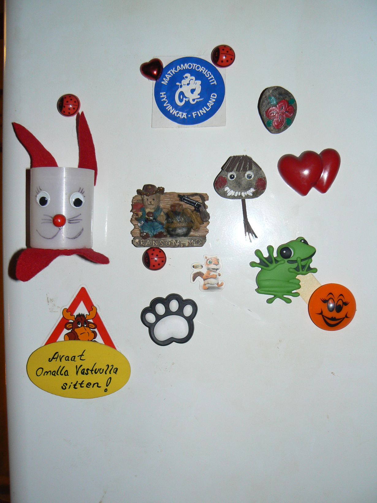 Tämä ihana arki: jääkaappimagneetti Jääkaappimagneettini :) 28.12.2013 klo 1:53 Osa noista itse tehtyjä. Etenkin se keltainen puinen hirven pään alla... ;)