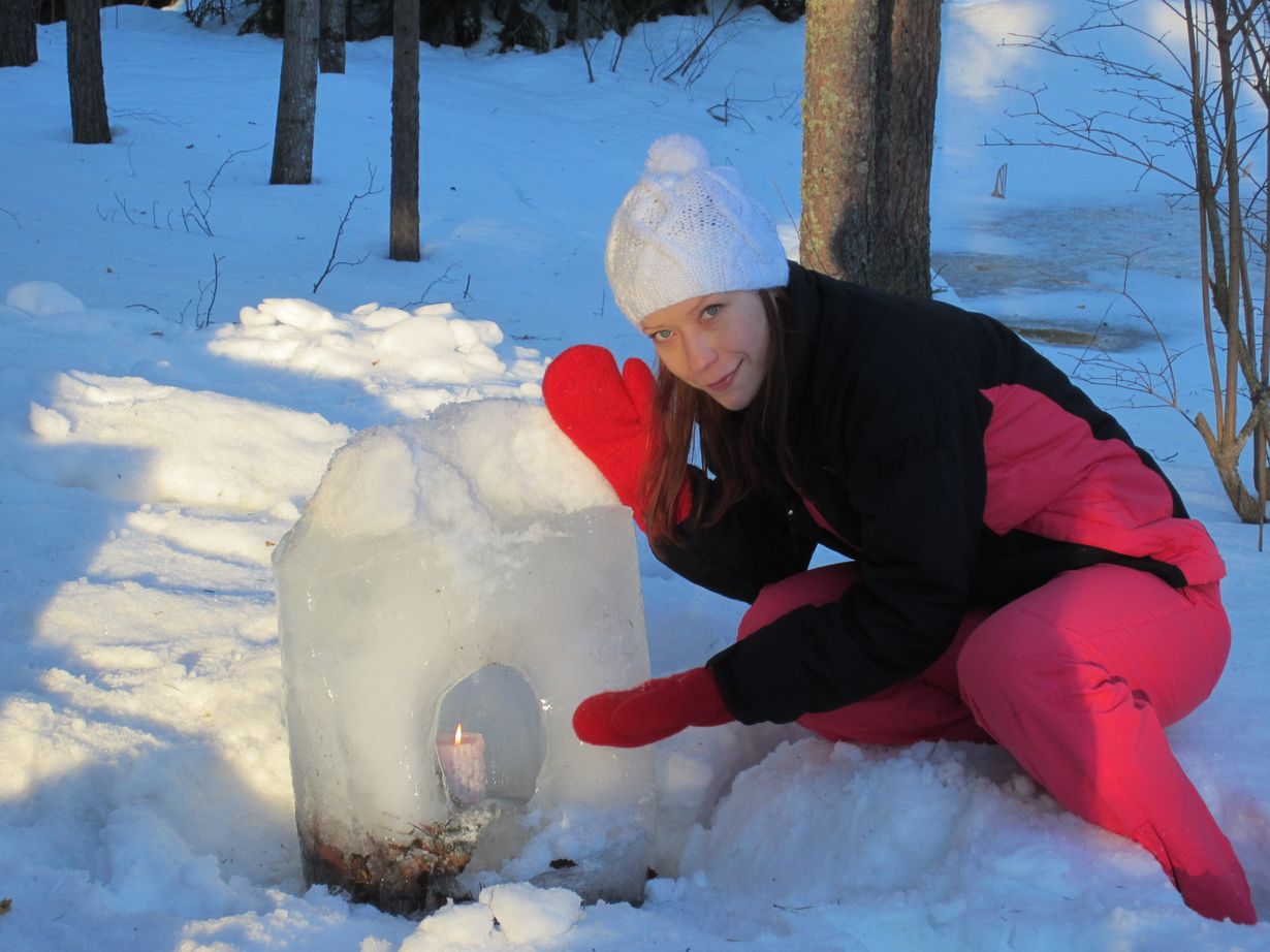 Sadevesiämpärin sisältö oli jäätynyt suureksi jääpalaksi eräänä talvena siskoni mökillä Nummi-Pusulassa. Halkaisin jään kirveellä ja huomasin, että sen sisällä olevaan reikään mahtui kynttilä. Tulin siis valmistaneeksi jäisen lyhdyn puolivahingossa :)