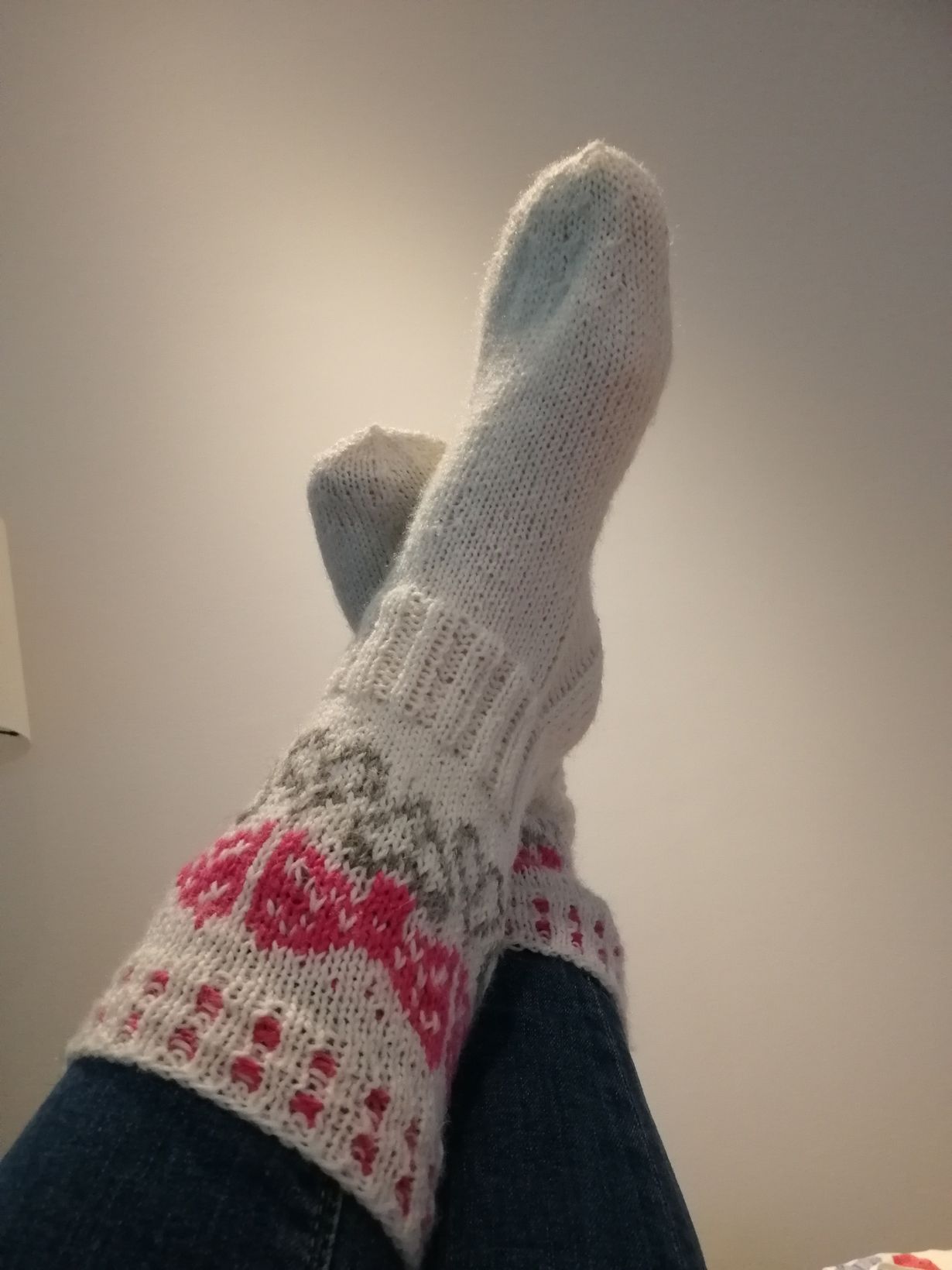 Lähetä kuvakisaan kuva villasukistasi - voita Familonin peitto ja tyyny! Jalat lämpimänä Karita 5.8.2022 klo 21:43 Sairastuttuani rintasyöpään, äitini neuloi minulle nämä Onnenrusetti-sukat. Lämmittää jalkoja ja mieltä.