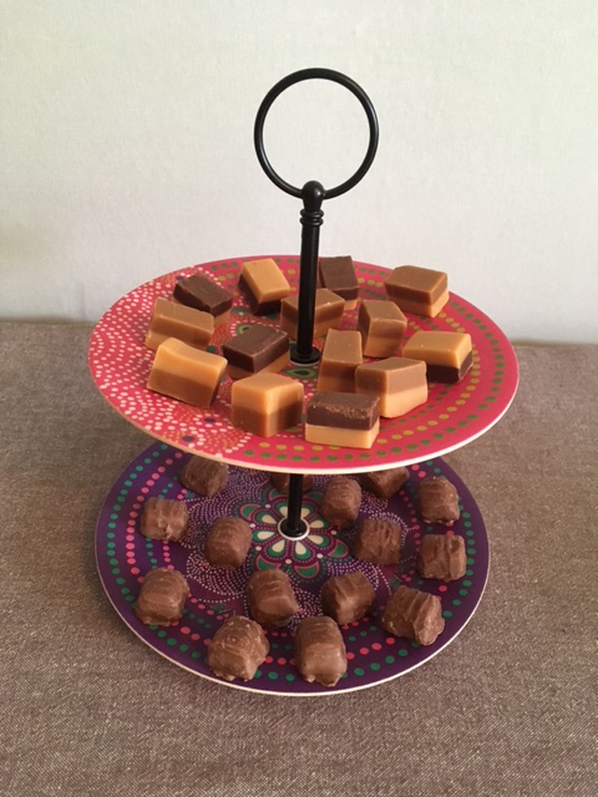 Herkuttelijan jälkkäri vati sisältää toffeeta ja käsin tehtyjä suklaita.