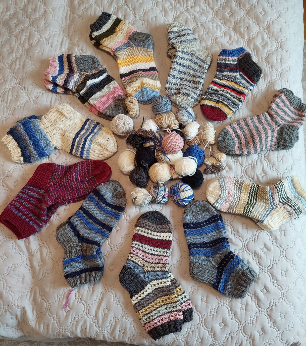 Onneksi minun jämälangat ovat jo aika vähissä. Olen tehnyt jämälangoista riemun kirjavia villasukkia. Ajattelin että nuo varmaan kelpaisivat joulukeräyksiin aikanaan.
