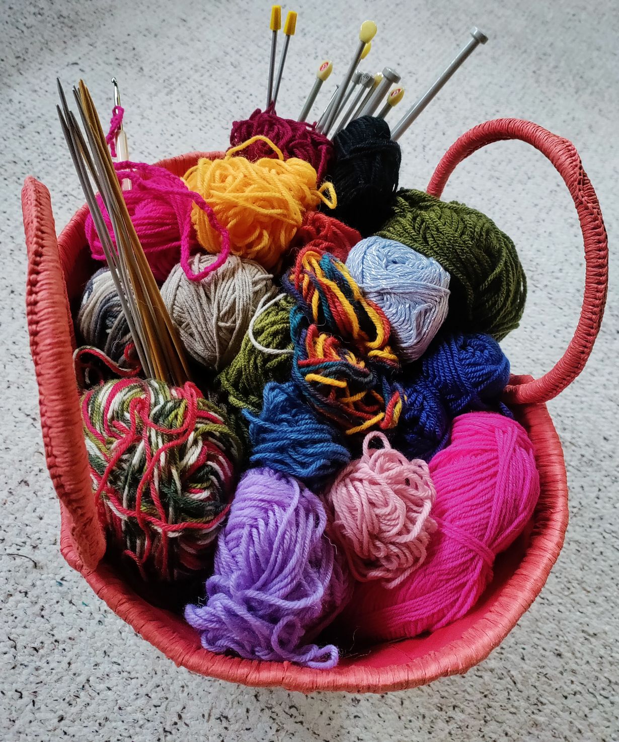 Vuosien varrella kertyneitä lankoja. Lastenlapset käydessään ottavat lankakorin esiin ja harjoittelevat kädentaitoja. Sormivirkkauksestahan se alkaa. Eläköön kädentaidot!