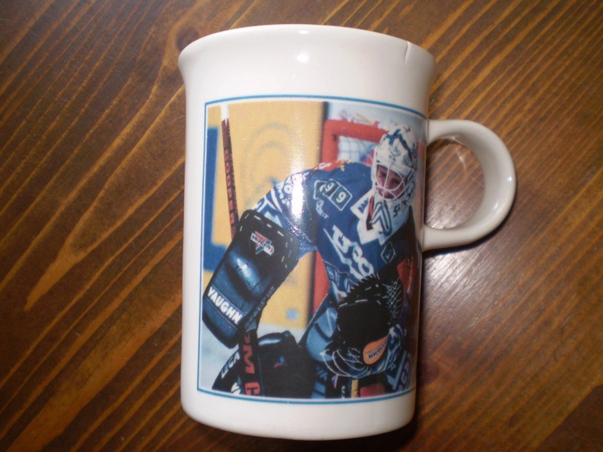 Olen saanut mukin joululahjaksi. Mukissa on pelivuosieni aikainen esikuvani Jarmo Myllys. Siitä on lohjenut jo pieni pala ja viiru ilmestynyt kylkeen. Voi sitä surun päivää, kun tämä muki hajoaa.