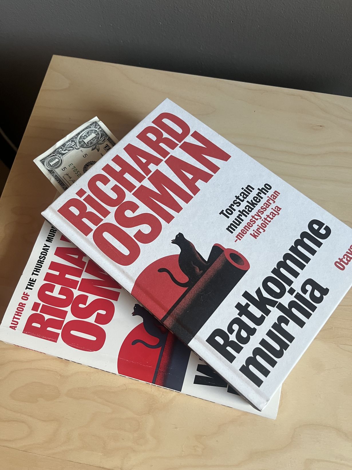 Nämä rakastamani Richard Osmanin teokset jännittävät yöpöydällä, kumpaa luen. Alkukielinen tarttui kyytiin Amerikan lennolle. Dollari kirjanmerkkinä!
