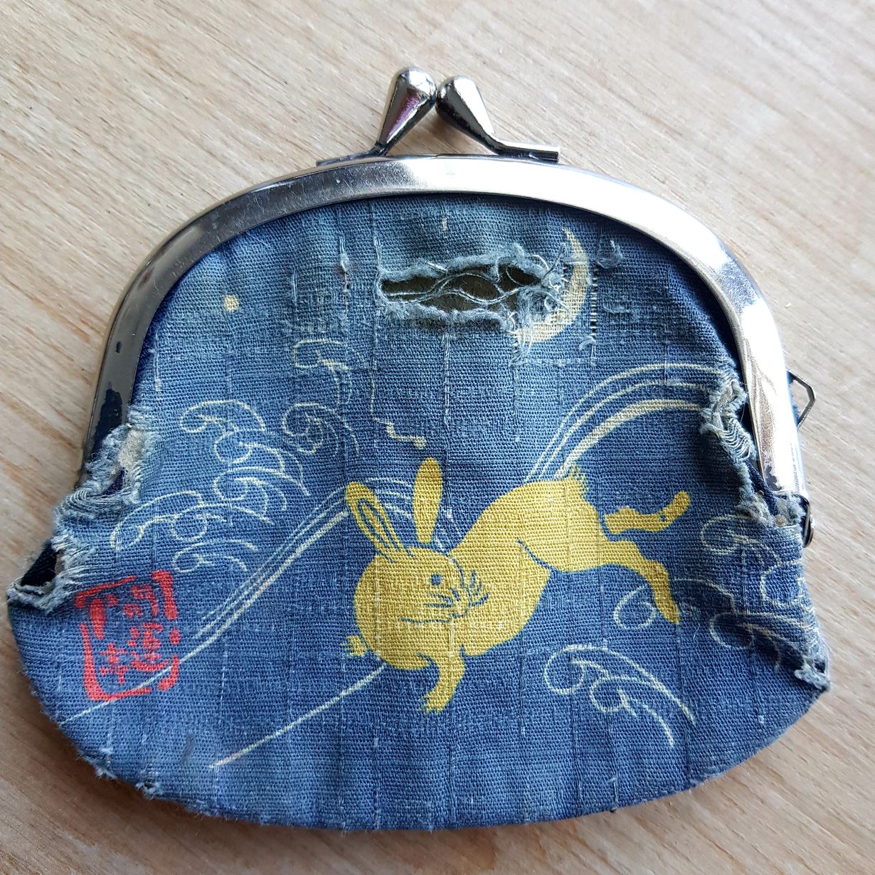 Ostin rakkaan kukkaroni Japanin työkomennuksella v 2009. Se on jo hiutunut, leikkaan kankaan kehyksestä ja käytän tilkkutyöhön.