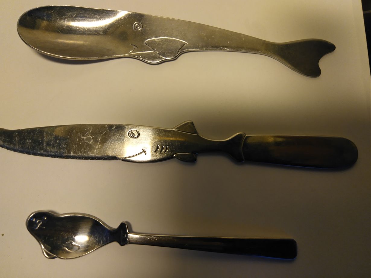 Ostin aikoinaan Japanista paikkallisesta akvaariokeskuksesta matkamuistoksi muille(ja itselle) aterimia.Tullissa vähän ihmettelivät turistia,jolla laukussa vasarahai-veitsiä ja norppa- lusikoita,unohtamatta valasta.