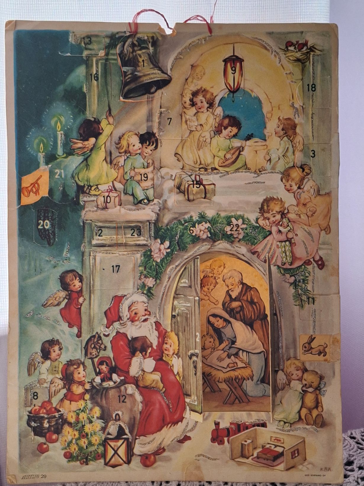 Viime keväänä nostalginen joulukalenteri löytyi muuttomme yhteydessä. Nyt 1950-60 lukujen taitteen kalenteri on jälleen käytössä avautuen jouluun.