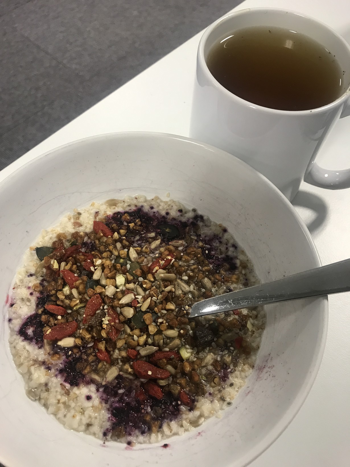 Puurolautasellinen koristeltuna mustikkajauheella ja superfood-rouheella, tästä saa monipuolisesti kuituja, hivenaineita ja vitamiineja. Jaksaa pinnistää vielä pari tuntia duunissa! Kylkeen kupillinen Mate-teetä!