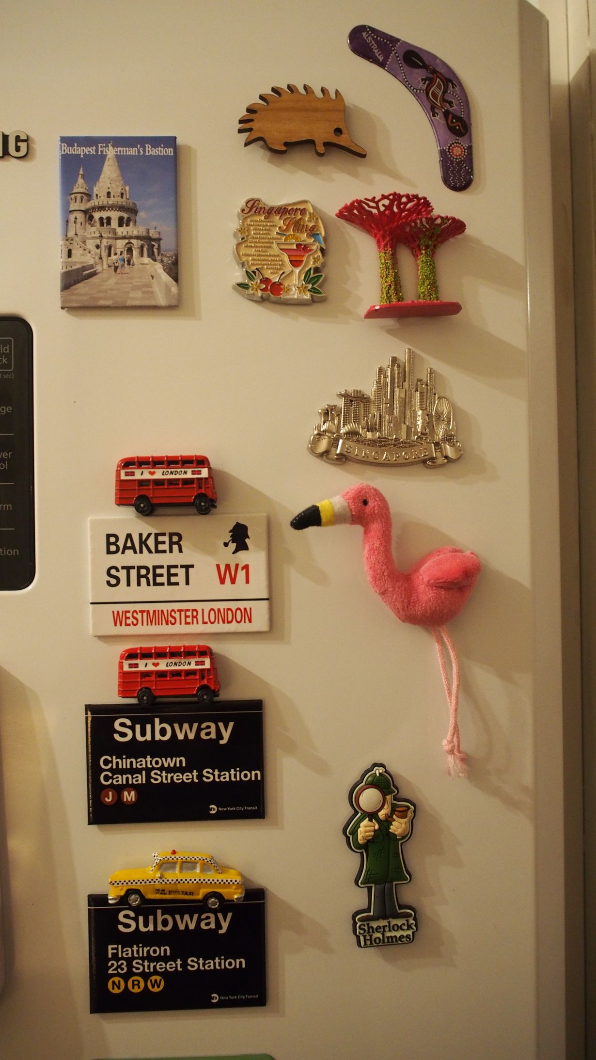 Matkamuistot Budapestista, Australiasta, Singaporesta, Lontoosta ja New Yorkista koristavat ryhmänä jääkaapin ovea. Vielä mahtuu lisää!
