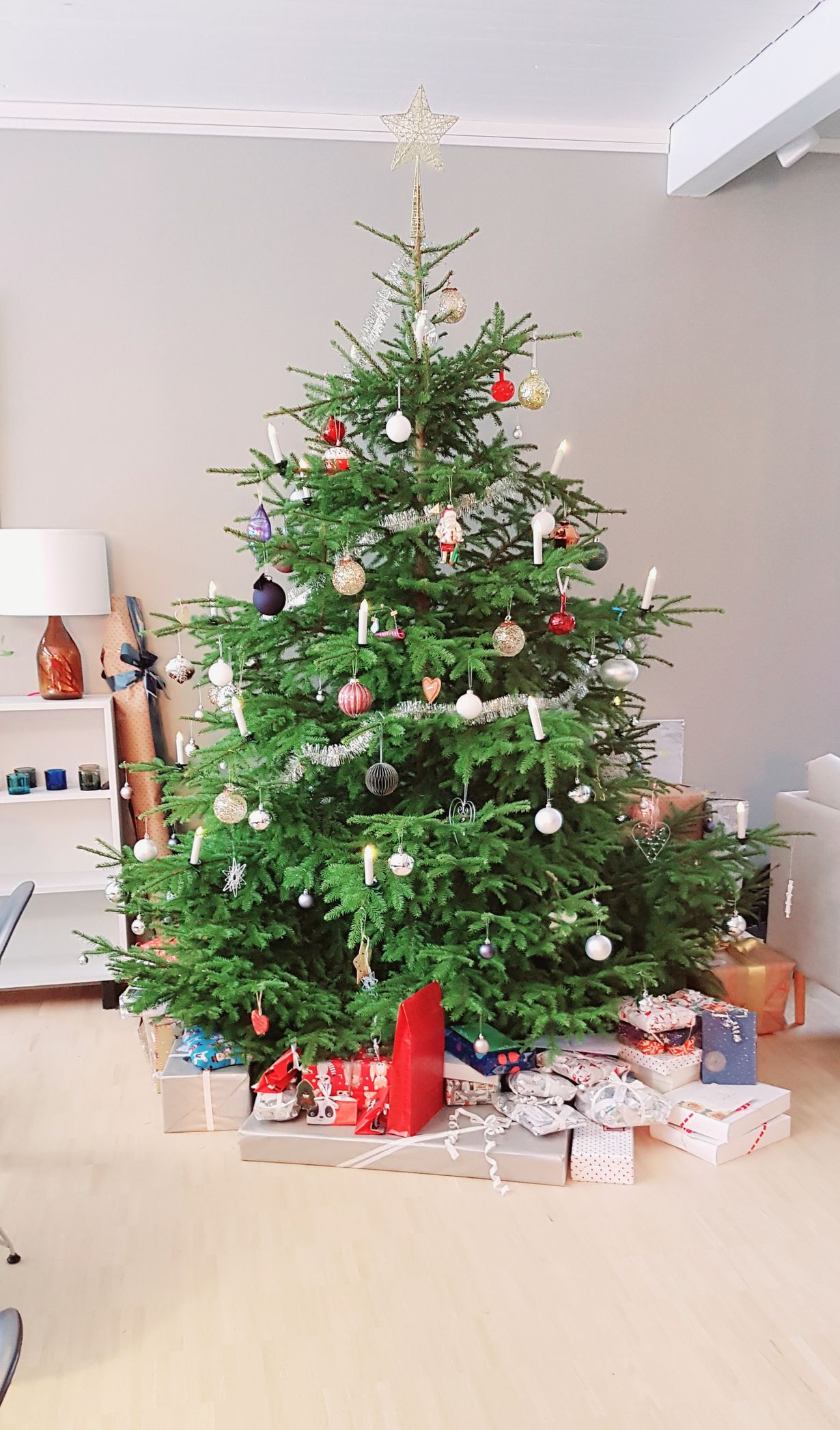 Jouluna 2020 tyttäreni perheen luona. Kuusen hakivat vävyni isänsä kanssa omasta metsästä. Kuusi oli ihanan kookas. Onneksi oli sille oli riittävästi tilaa loistaa upeuttaan!