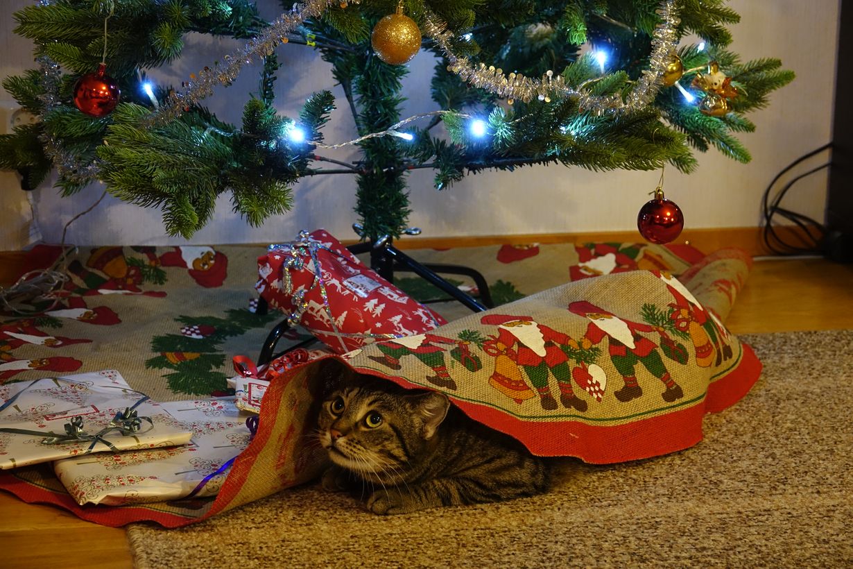 Meidän Viljo-kisu ihastui niin paljon tähän joulukuusen mattoon,että jätimme sen paikoilleen seuraavaan jouluun asti.Se tykkää mennä sen alle piiloon ja hyökätä sieltä,kun heitämme sille nameja.