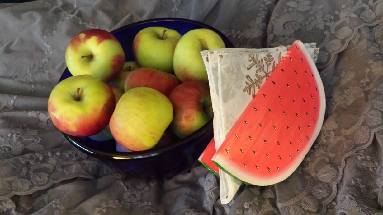 Tämän serviettitelineen tarina on kirpputorilöydöstä, jonka alkuperä on käsin tehty puusta veistäen sekä maalatu ja käsityöläisen puodista aikoinaan hankittu tarpeettomana kulkeutunut kirpputorille:)Meidän kodissa on hauska vesimeloniherkkumme kuvallinen symboli, kun aina odotetaan vesimeloniaikaa, herkkuhedelmä myöskin omenoiden ohella meille siis!