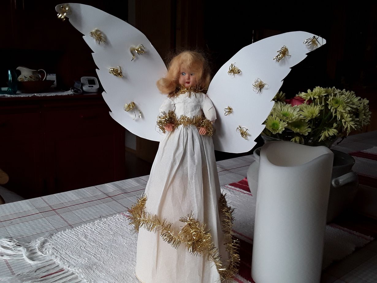 Vuonna -73 äitini antoi ensimmäiseen jouluumme enkelin joululahjaksi. Sittemmin puku ja siivet on uusittu, mutta enkeli saapuu edelleenkin joka joulu.
