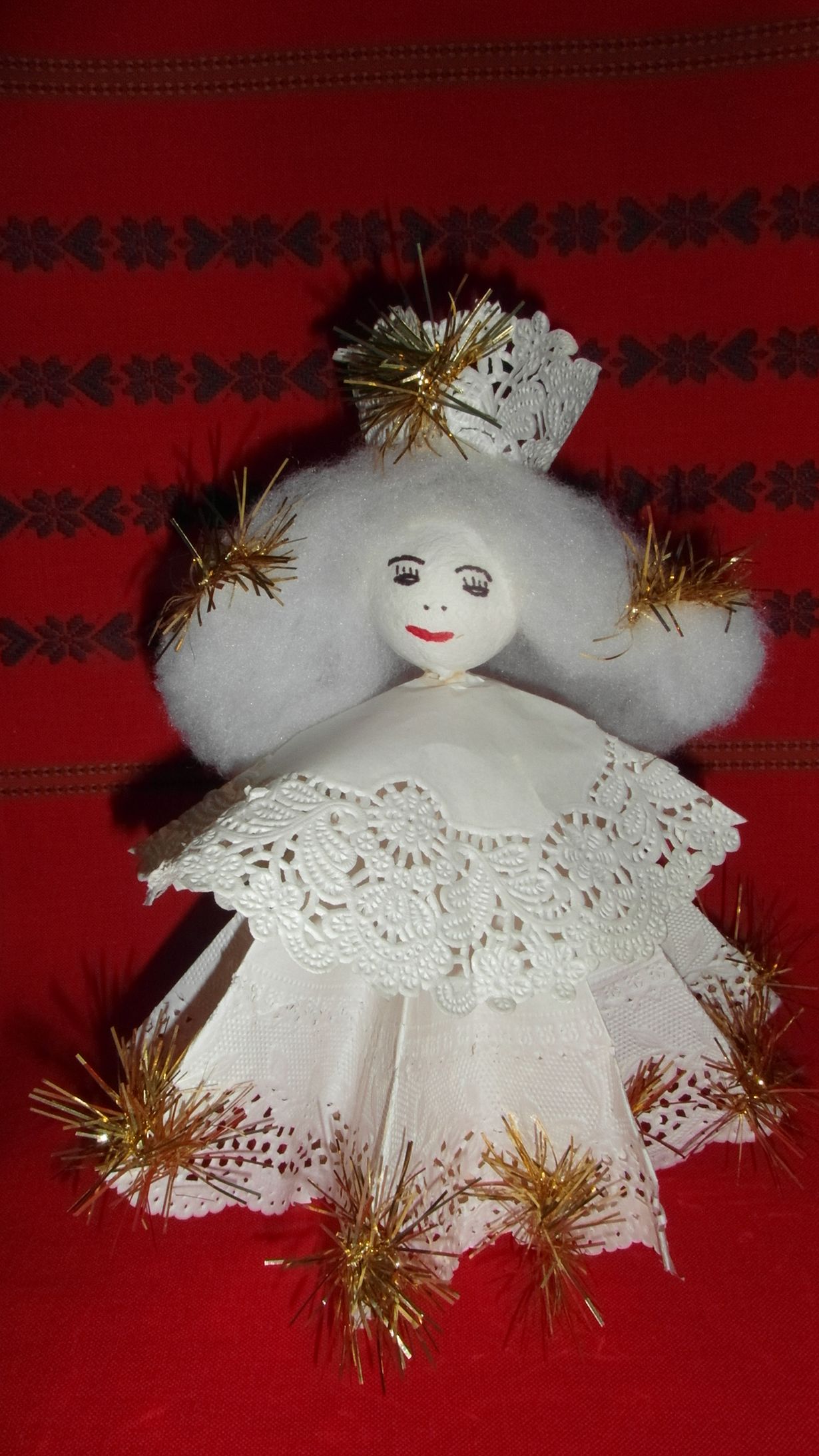 Melkein 40 vuotta sitten, kun naapurimme tyttö oli päiväkerhoikäinen, lapset askartelivat siellä näitä ihania enkeleitä. Meillekin hän toi tällaisen joululahjaksi. Se on ollut joka Joulu siitä lähtien aina paraatipaikalla meidän Joulussamme.
