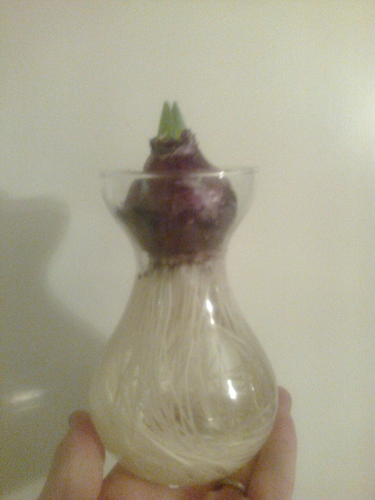 Tämä hyasintti on ostettu Nummelan Lidlistä noin kuukausi ennen joulua 2014 joulukukaksi. Se teki tosi tomerasti juuria, mutta kasvua ei ollut ollenkaan ennen tammikuun puoliväliä, jolloin ensimmäiset vihreän vivahteet tulivat näkyviin.