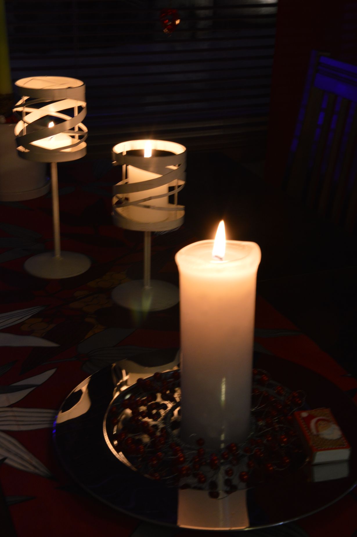 Keittiönpöytä sai jouluisen ilmeen jo marraskuussa Pentikin kynttilänjaloista ja perinteisestä marmorikynttilästä kynttilämansetin kera. Joulua odotetaan jo innolla.