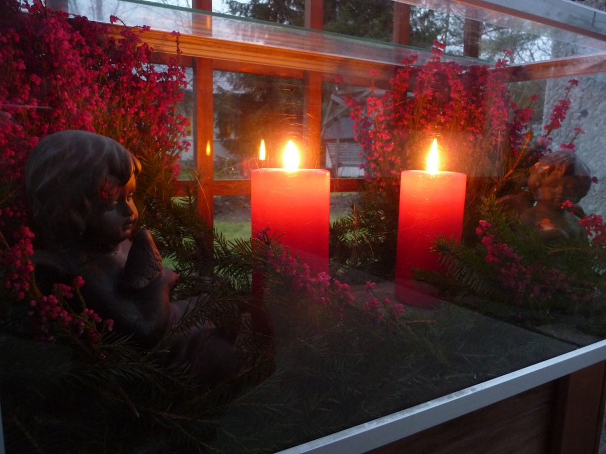 Kuistin enkeli/kynttilä astelmani syntyi kierrätysmateriaaleista: Kesällä vuotamaan alkanut akvaario sai uutta käyttöä ja vuosien saatossa kolhiintuneet keraamiset enkelit sopivat hyvin ulkokoristeeksi ja jouluisen tunnelman luojaksi.