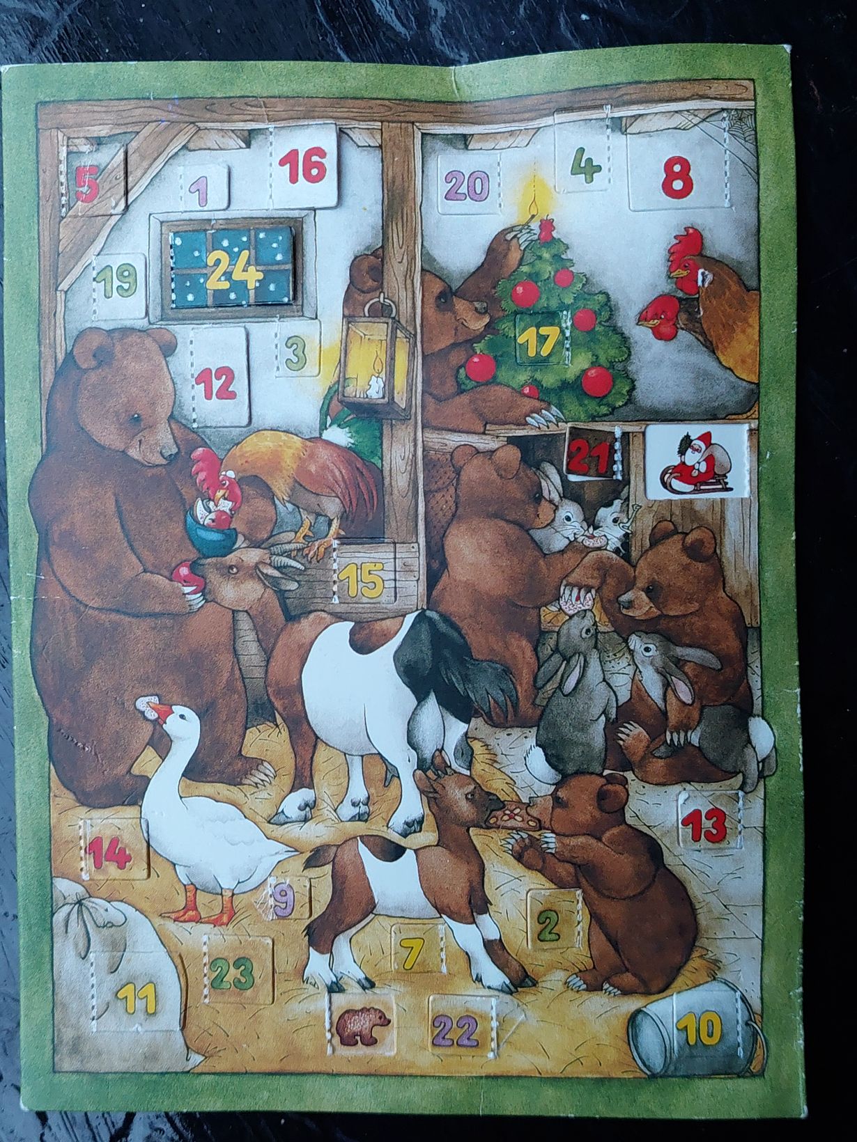 Tallella on vain pieni postikorttikalenteri. .Ostan usein partiolaisten yms. kannatuksena joulukalenterin ja annan suvun lapsille.Annan hyvän kiertää ja syön suklaani muuten vain!