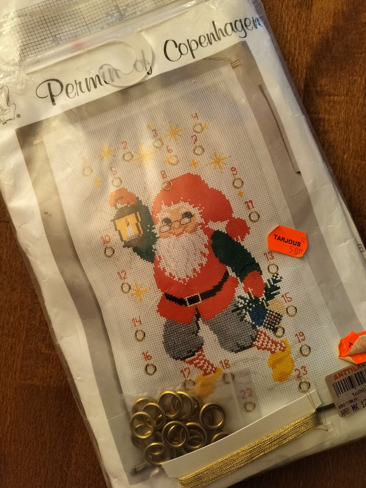 Ostin joulukalenteri-kirjontapaketin 90-luvun alussa, kun lapset olivat ihan pieniä. Tarjouksessa 5 markkaa. En ehtinyt tehdä sitä ja lapset kasvoivat ohi joulukalenteri-iän. Ajattelin tehdä sen sitten lapsenlapselle, mutta hänkin on jo 13. Onneksi syntyi taas lapsenlapsi viime kesänä. Varmastikin teen sen hänelle.