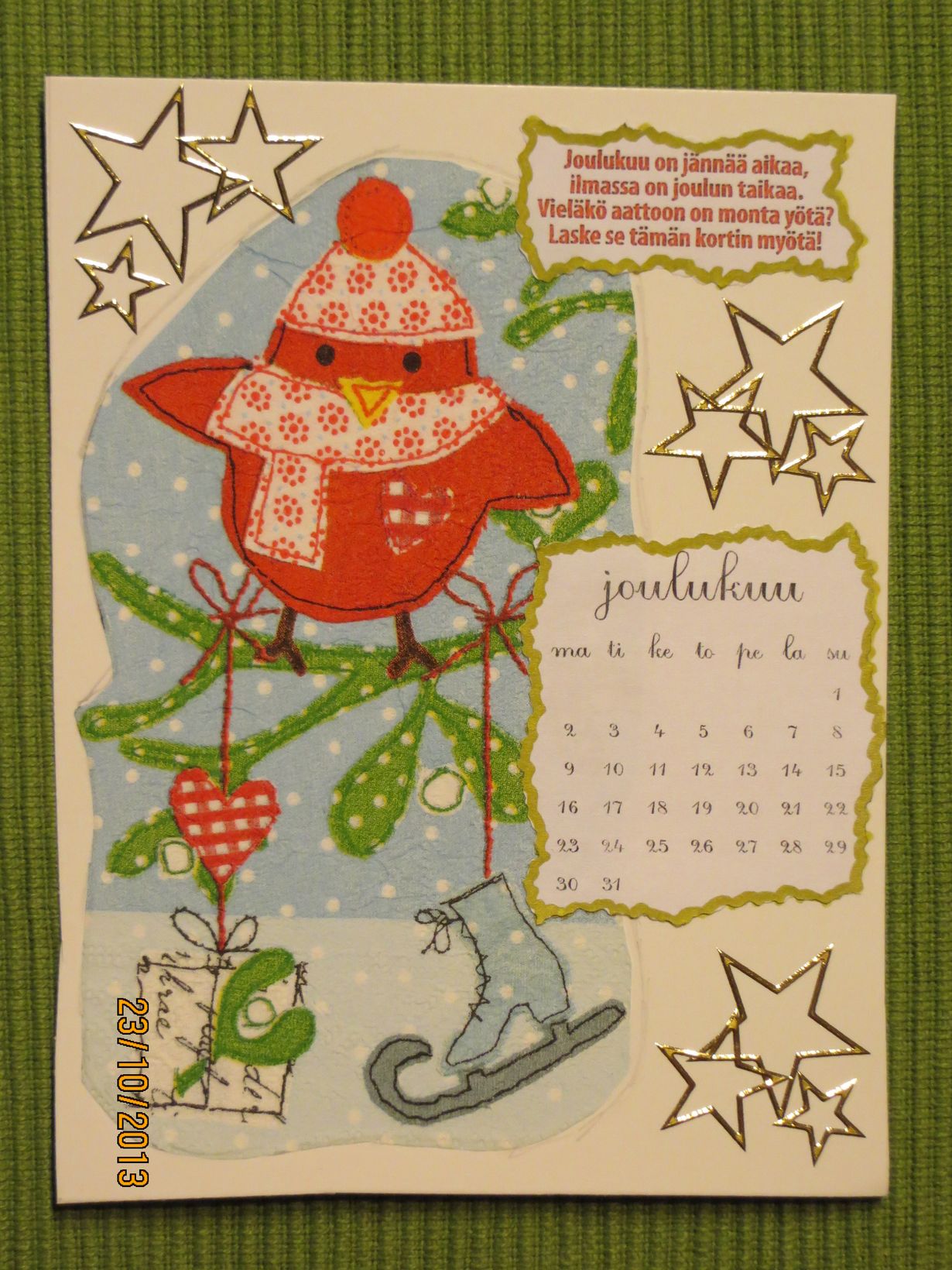 Hei. Askartelin joulukalenterikortit täksi Jouluksi. Lähetän ne marraskuun lopulla, niin vastaanottaja voi vaikka rastittaa päivät, jos niin haluaa. Idean tähän korttiin sain viimeisimmästä Taika-lehdestä.