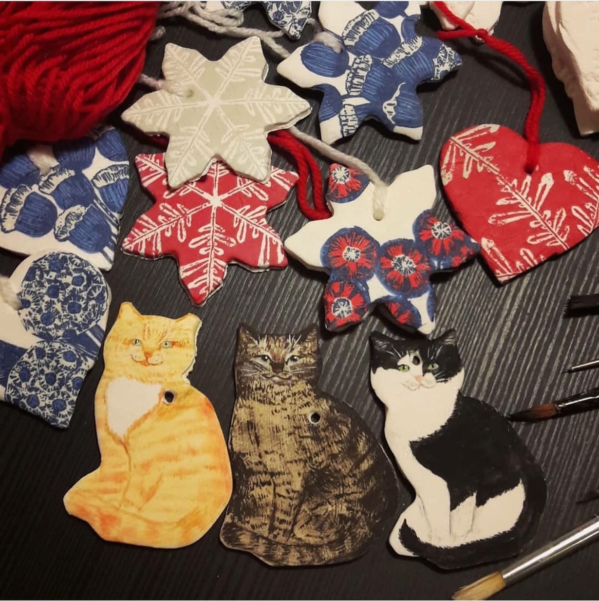 Joulukoristeet soodataikinasta, koristeltu decoupagetektiikalla ja kissanmuotoiset maalattu akryylimaaleilla - lahjan saajan kissan näköisenä tiettysti.
