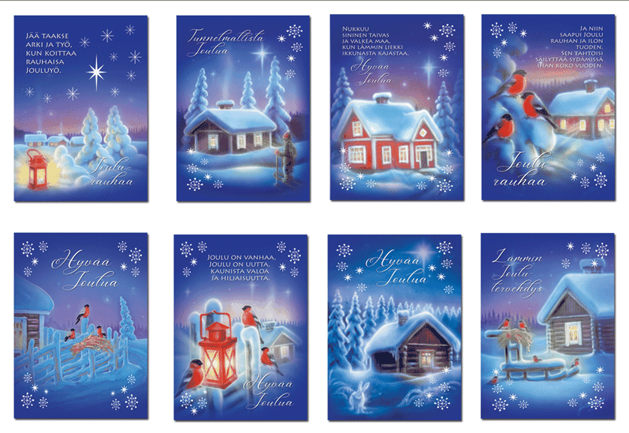 "Sininen hetki" on kaunis ja rakastettu joulukortti-sarja, jossa Jari Välkkysen tunnelmalliset kuvat sekä Nina Ramstadiuksen jouluiset toivotukset luovat tunnelmallisen kokonaisuuden.