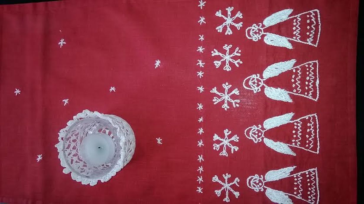 Lapsuuden joulupöydässä äidin kirjailema liina 1950-luvulla.