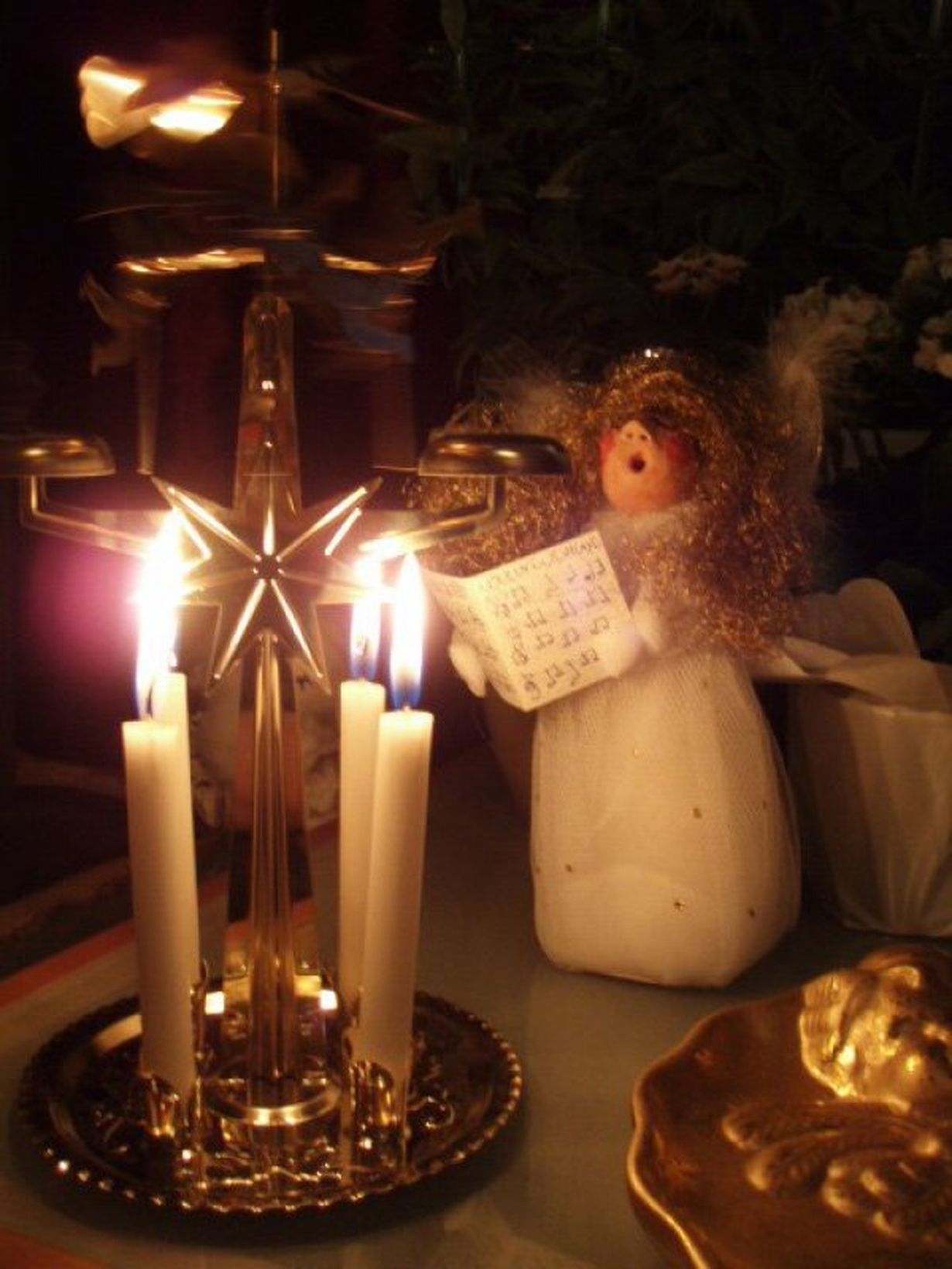 Joulun enkelikoristeina vanha, jo lapsuudesta tuttu enkelikello, kultainen enkelilautanen sekä lapseni koulukaverin äidin, Johannan tekemä laulava jouluenkelikoriste. Johanna myy käsintekemiään koristeita koulun myyjäisissä ja työhuoneellaan. Tähän enkeliin ihastuin heti kun sen näin. Se jotenkin hehkuu laulun iloa ja nautintoa sekä joulun lämmintä hartautta.