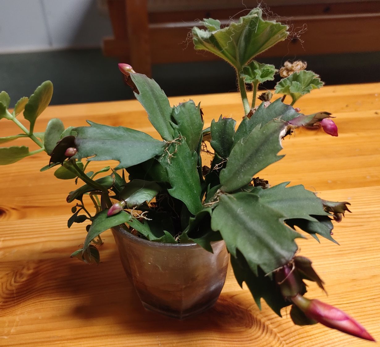 Toissa joulun jälkeen pelastin amarylliksen juurella nuokkuvat kaktuksen oksat vesilasiin. Istuttamatta ovat edelleen, mutta pari päivää ennen joulua yllättivät nupuilla.