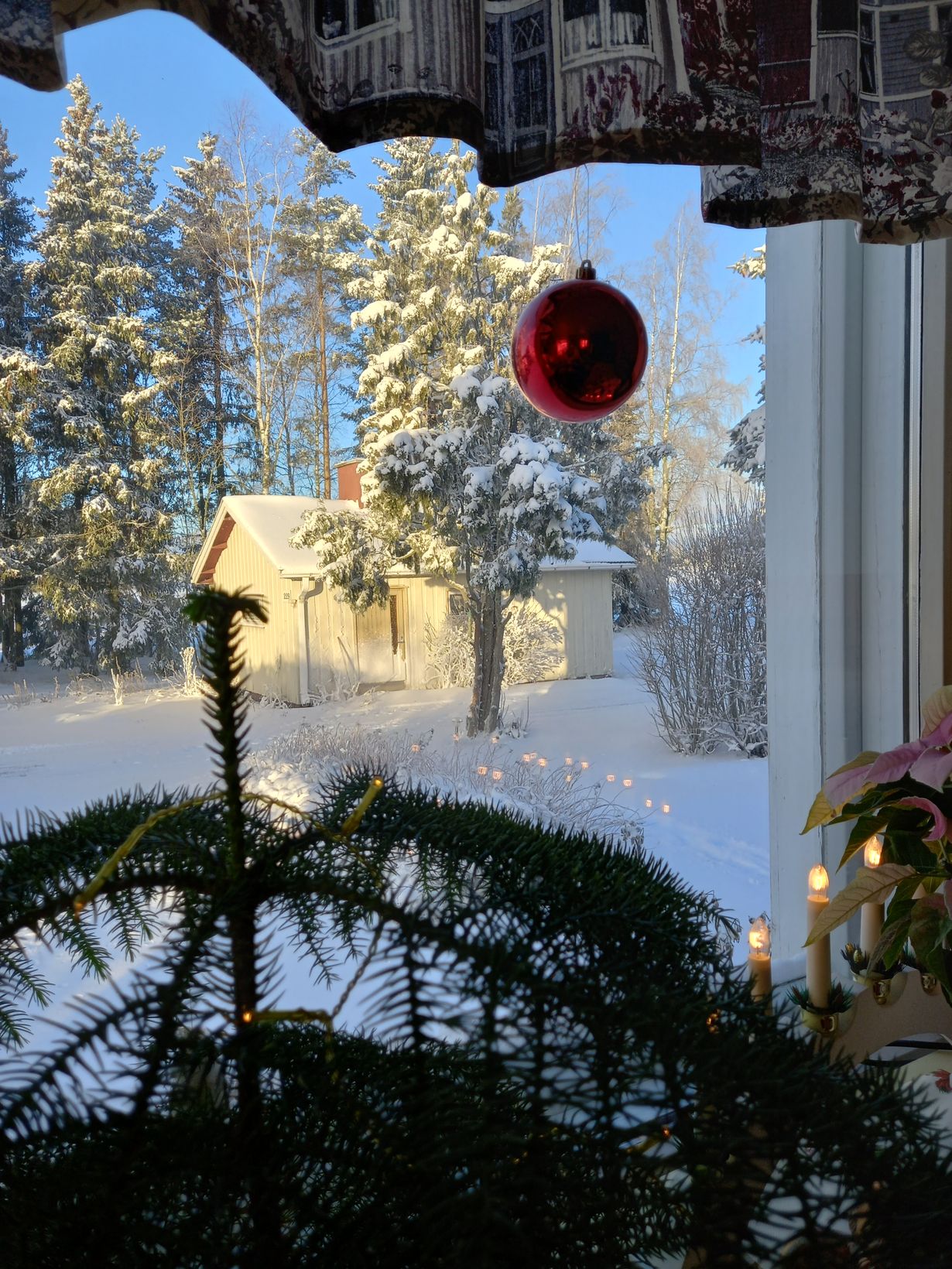 Huonekuusi nostetaan kotiin hyvälle paikalle. Joulukoristeena reilun kokoinen punainen pallo. Valoa ja kukkia, jokin kiva koriste. Siinä, siinä se joulu on.