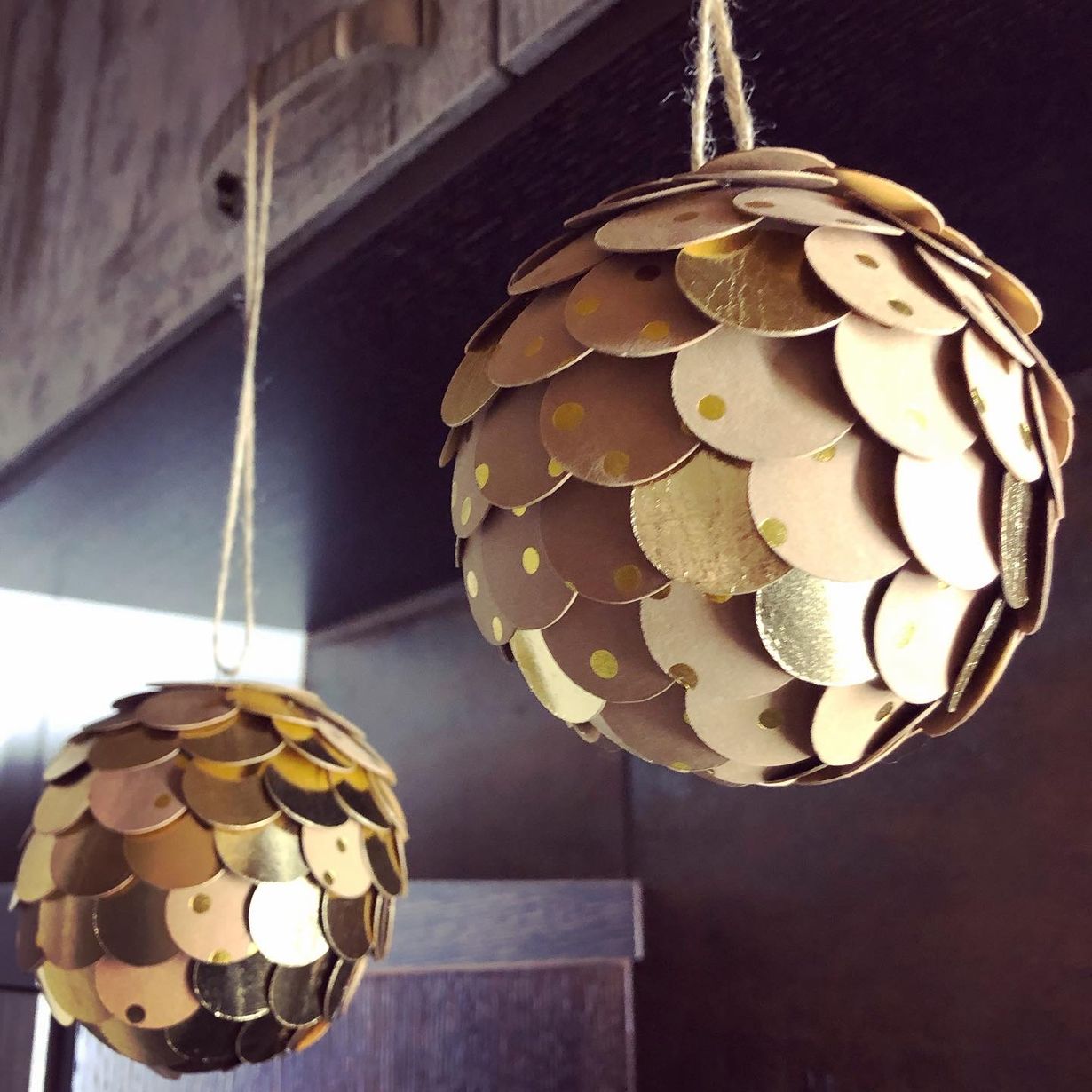 Viime joulun alla pidimme ystäväperheen kanssa pikkujouluviikonlopun, jonka aikana askartelimme paljon kaikenlaista jouluaiheista. Näistä nahkapaperiympyröillä päällystetyistä palloista tuli omat joulukoristesuosikkini!