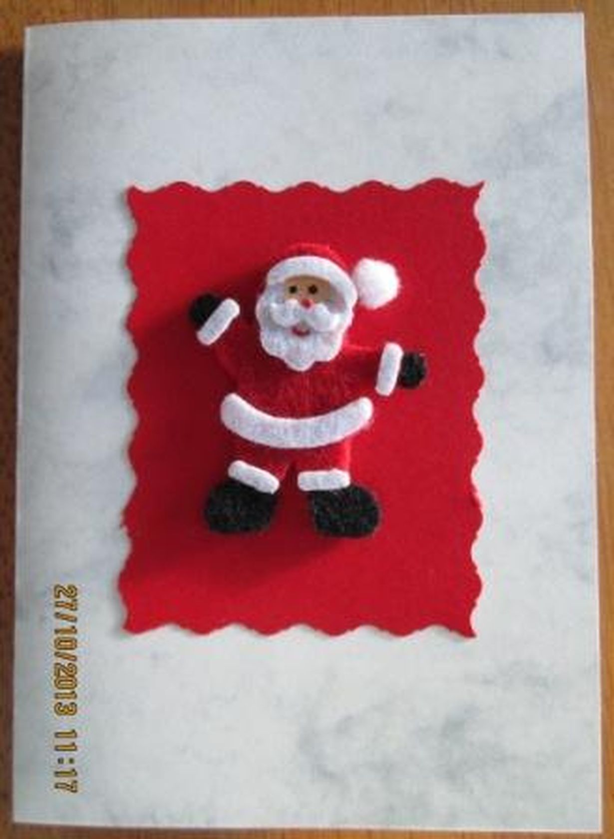 Kun kortteja tekee vuosittain 50-60 kpl, pitää toteutus olla helppo ja nopea - ja siltikin niiden kanssa saattaa kulua parikin viikkoa aikaa. Tässä marmoroidulla korttipohjalla pala punaista kartonkia ja huopapukki. Sisäsivulla korutekstauksella joulutervehdys.