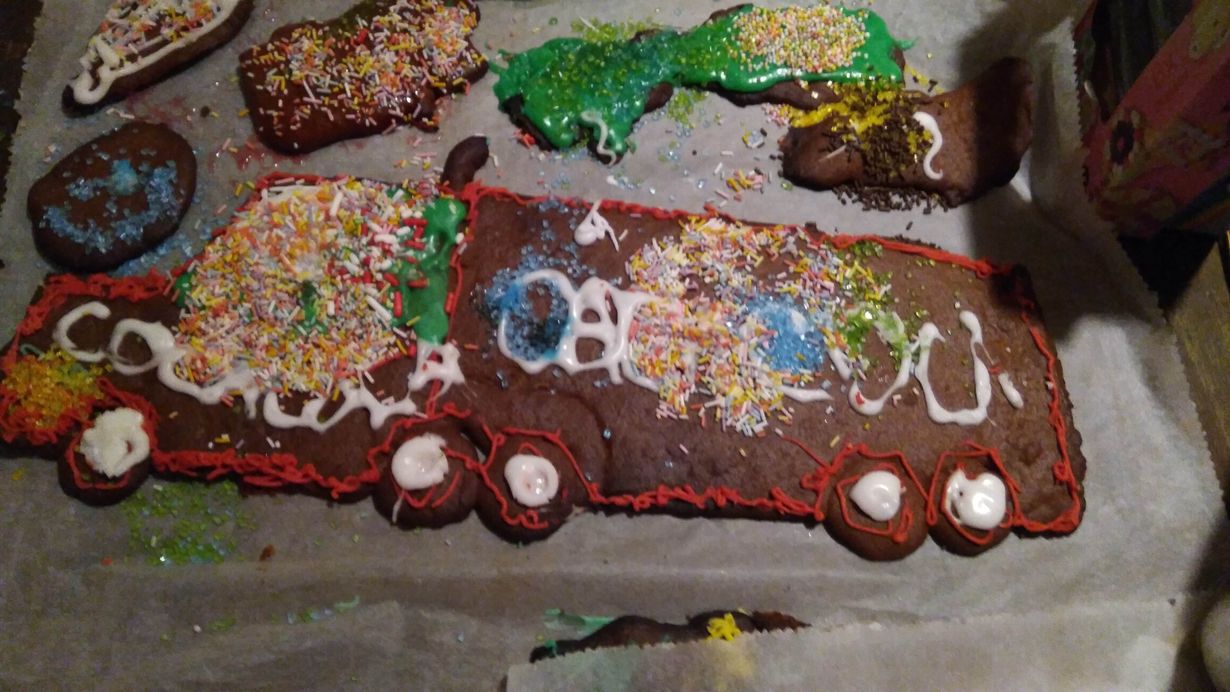 Jättimäinen joulupiparirekka, nelivuotiaan pojan ja isän yhteistyössä tehty.