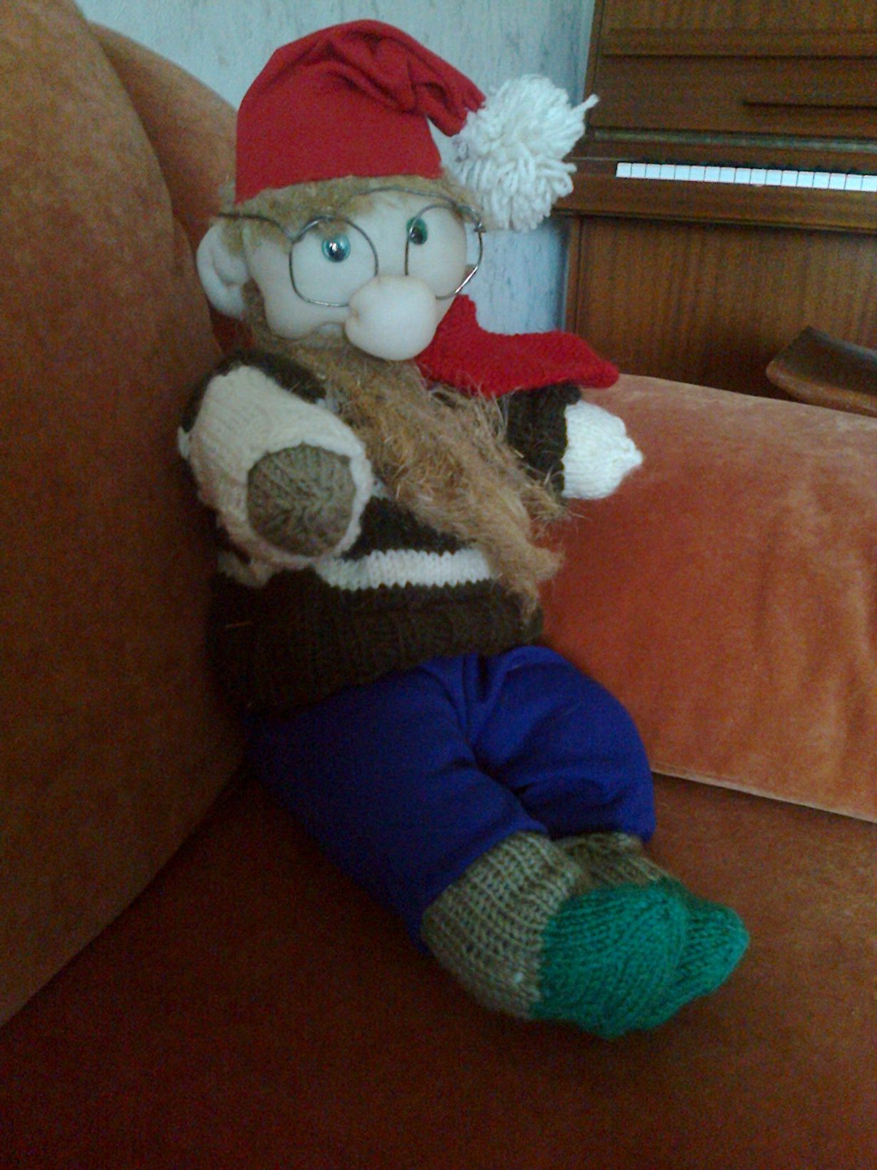 Mieheni teki parikymmentä vuotta sitten päivätoiminnassa asiakkaiden kanssa tonttuja, joihin asiakkaat neuloivat osat ja mieheni kokosi ne tontuiksi. Pitihän kotiinkin muutama ostaa ja siitä asti tämä on muutamien kavereidensa kanssa viettänyt joulunsa sohvallamme.