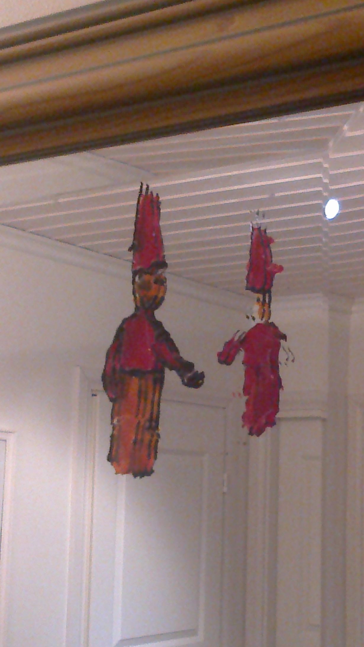 Nämä joulutontut ovat kaunistaneet vintin peiliämme jo yli 10 vuotta, eikä niitä raaski ottaa pois. Jonne poikamme on taiteillut ne eskarissa ja on nyt jo 17 v.