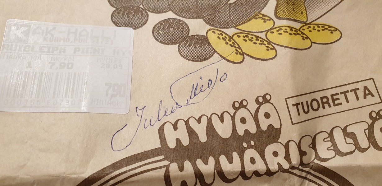 90-luvulla Juha Mieto oli täällä Kainuussa paikallisessa ruokakaupassa vierailemassa. Ei muuta paperia siihen hätään löytynyt, joten hän kirjoitti nimmarin konsulentin leipäpussiin.